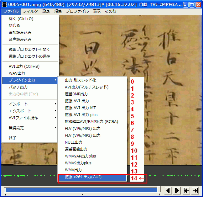 別なプラグイン出力に変えてみる。「例:拡張x264出力(GUI)Ex→拡張AVI出力plusなど」