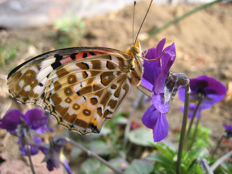 成虫はほんと、綺麗です。トゲがあって毒々しい幼虫がこんなに綺麗に変体するのは不思議で仕方が無いです。ちなみに、幼虫の主食はスミレ科の植物の葉で、かなり食欲旺盛です。この個体が蜜を吸っている花も、スミレ科のビオラですね。