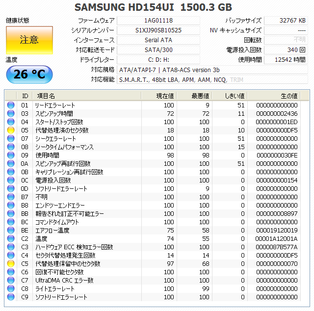 『ID:C5 代替保留中のセクタ数』にも注意レベルの異常が現れていますが、これは以前に論理的な障害による代替保留セクタという事が判明しており、使用上特に問題は出ていませんでした。