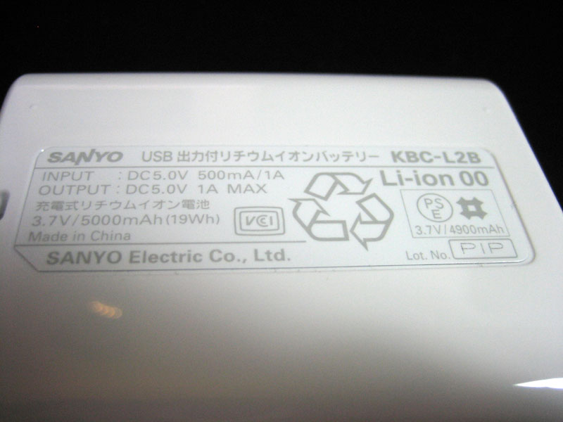 出力は3.7V/5000mAh(19Wh)、製造国はMade in Chinaでした。