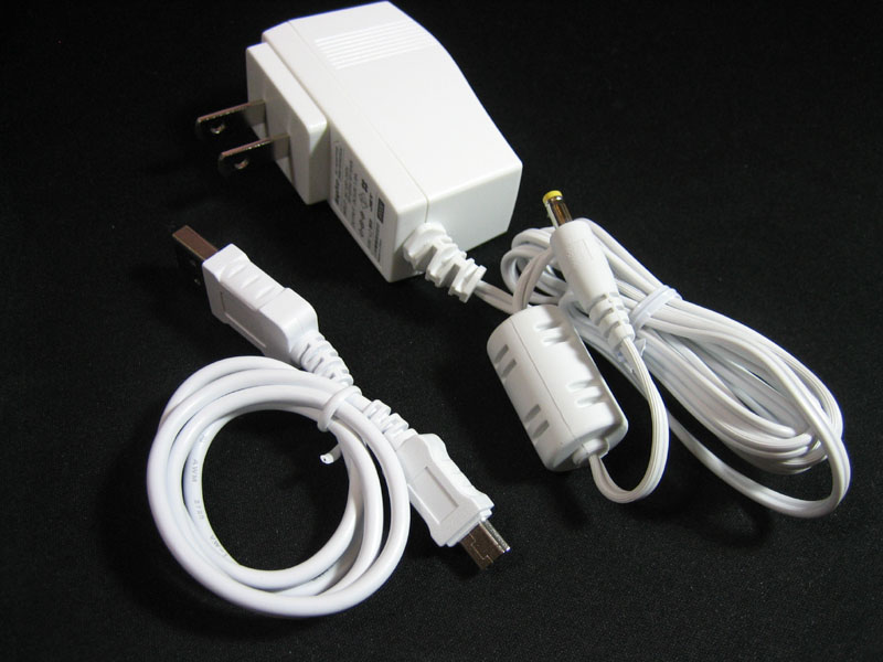 写真右(又は下):付属のUSBケーブルとACアダプター。白いです。