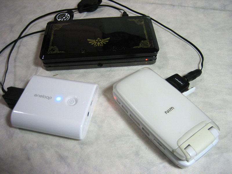 ちなみに、写真のケータイは電池スペックが3.7V/870mAhなので、電源バッテリーで約5.7回充電できる計算になり、3DSの電池スペックは3.6V/1300mAhなので、電源バッテリーで約3.9回分も充電できる計算となります。凄っ。
