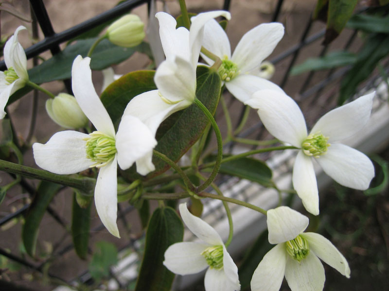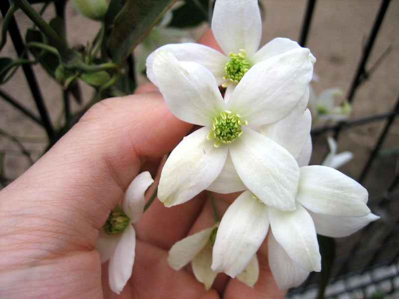 花の大きさは約4~5cm。『常緑・笹のような細長い葉の形』という、他には無いタイプのクレマチスですが、花の形と大きさは、春咲きのモンタナ系クレマチスとかなり似ています。