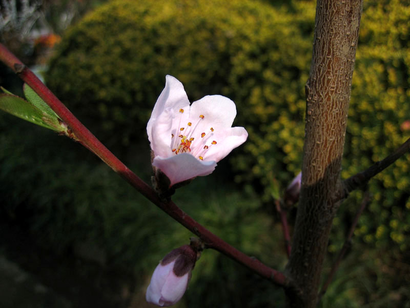 ボナンザピーチは若い頃から花と実を付ける鉢植え向きの桃で、ドワーフピーチとも呼ばれています。