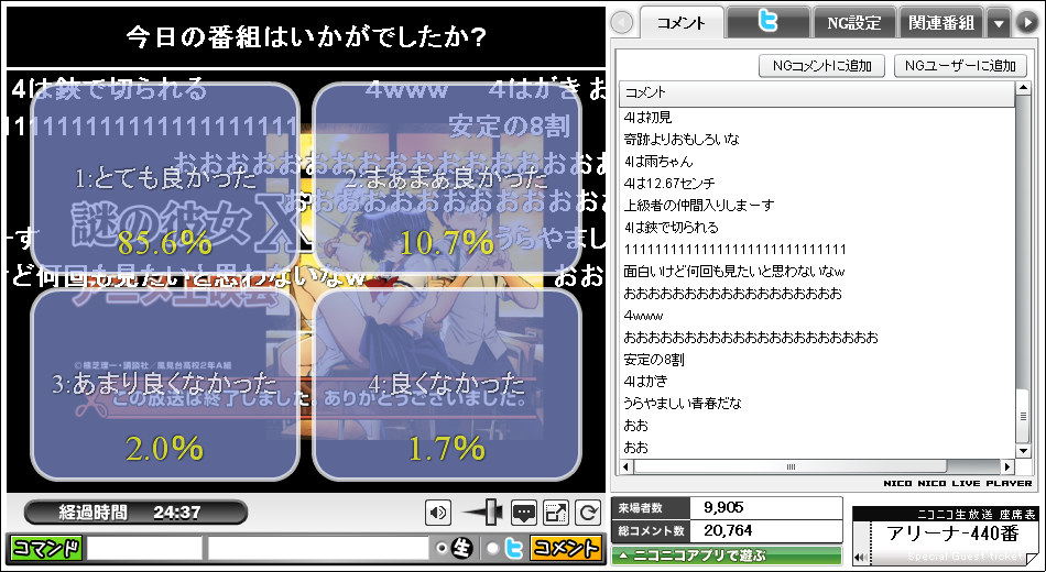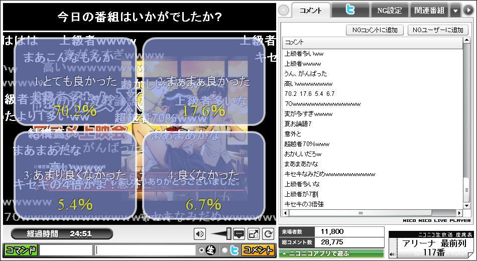 上の画像が1話・2話ニコ生配信時の番組評価アンケートのキャプチャー画像なのですが、なんと、1話の【1:とてもよかった】が、70.2%、2話になると85.6%まで上がっています。これは結構、凄い事です。正直、良くて【1:とてもよかった】は30~40%位だと思っていたので、結果を見ながら目を見開いて驚いてしまいました。この結果には他の視聴者も驚いたようで、コメント欄に驚きのコメントがあふれているのが判ります。