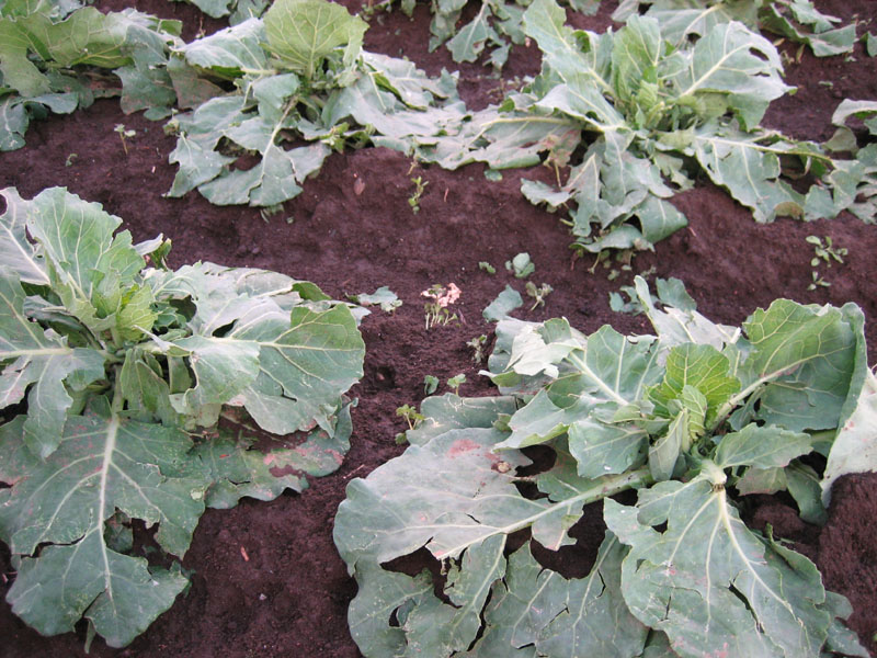 隣の畑では、農家の方が売り物用に育てているキャベツにダメージがありました。これ、まだこの時期なら回復もできそうですが、結球した後のキャベツだったら売り物にならなくなりますよね・・・。