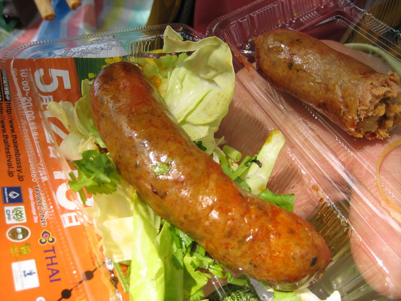 ソーセージはパリッとはしておらず、柔らかくてジューシーなソーセージでした。味はスパイシーで辛く、ビールやご飯に合いそうな濃いめの味で、とても美味しかったです。また、つけ添えの野菜に香草(パクチー)が添えられているのがタイらしい感じでした。