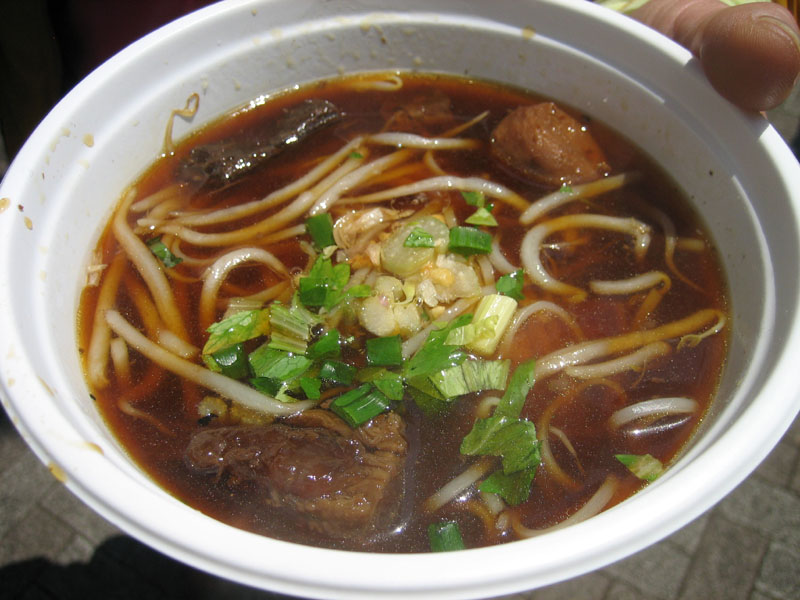 右の写真(又は下の写真)の、牛すじ入りタイラーメン(Beef Thai Noodles)500円です。