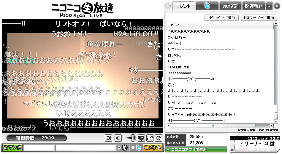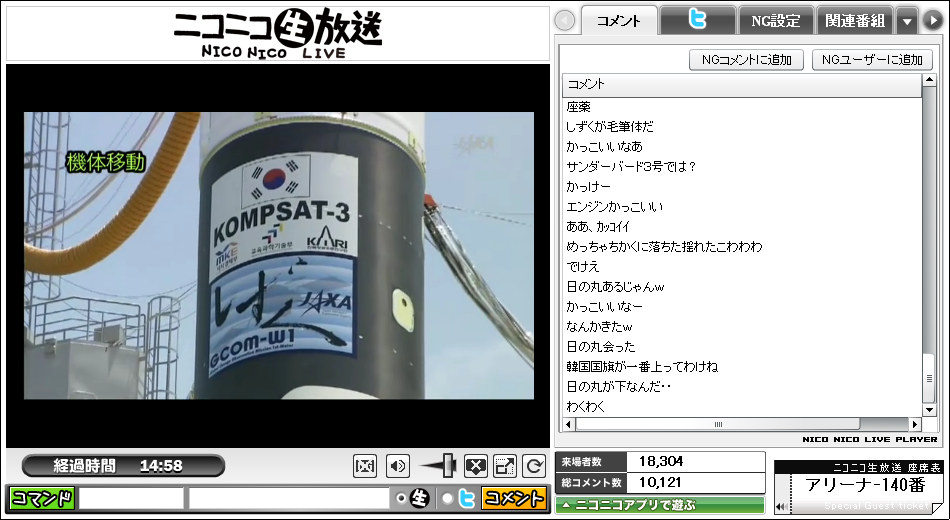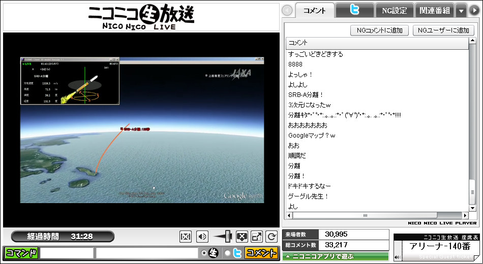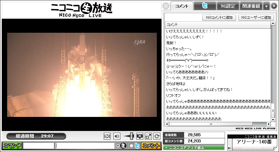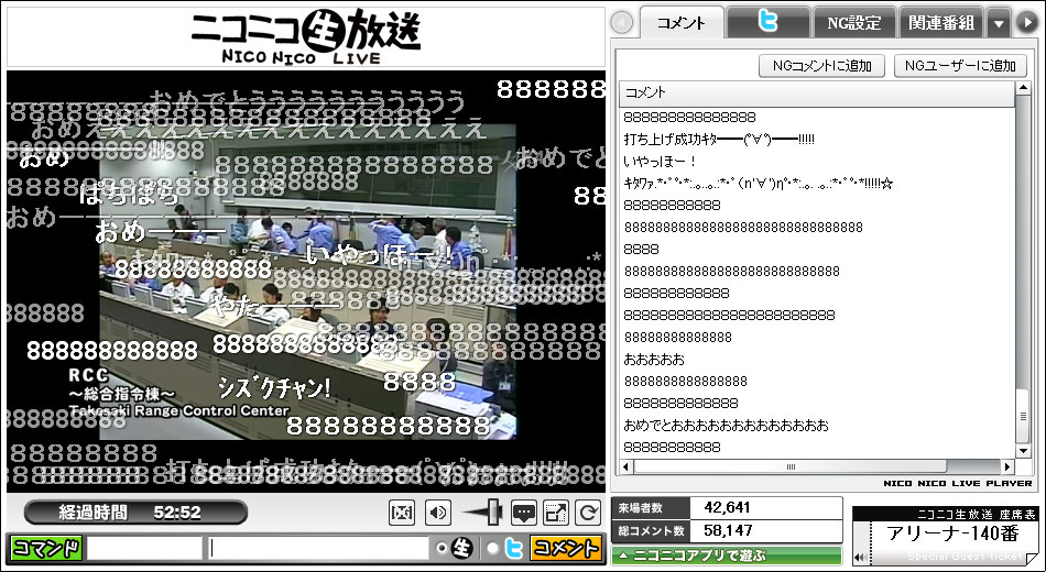 そして、ロケット打ち上げから23分後、観測衛星しずくの分離が成功したという一報が届き、管制室では拍手と握手が交わされ、ニコ生では「888=パチパチパチ=拍手」の弾幕が起こり、賛辞が送られました。