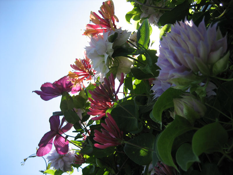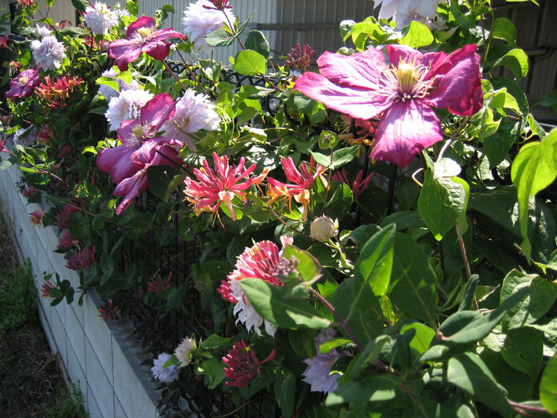 花の品種は、赤い大輪の花が、クレマチス『ビルドリヨン』、薄い青紫色の八重咲きの花が、クレマチス『ベルオブウォーキング』、花火みたいな朱色とオレンジ色の花がツキヌキニンドウ(※品種不明)です。