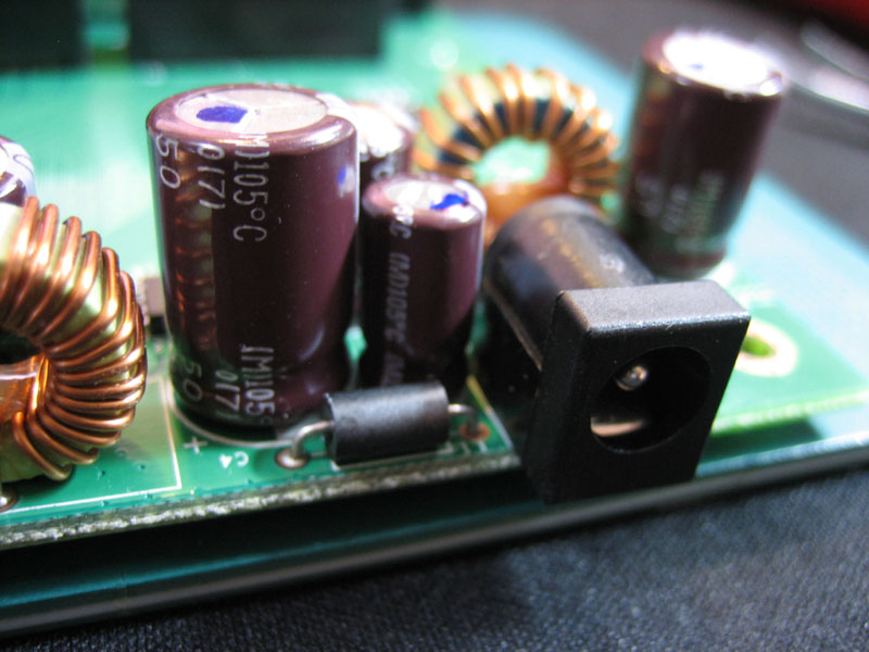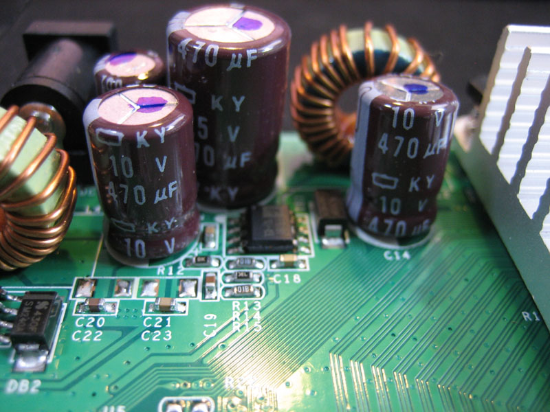 写真の中に銅線が巻かれたチョークコイルが2つ見えますが、コイル鳴き防止の為か、コイル内部が接着剤で固められていました。