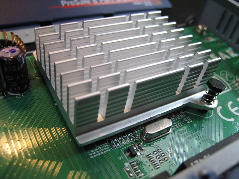 左:上蓋。右;ヒートシンクは対角にある2つのプッシュピンで固定されていますが、基盤の背面からでないと引き抜けません。プッシュピンを引き抜くために、基板をケースから分離。4つの固定ネジを取り除き、基板を裏返しにしました。