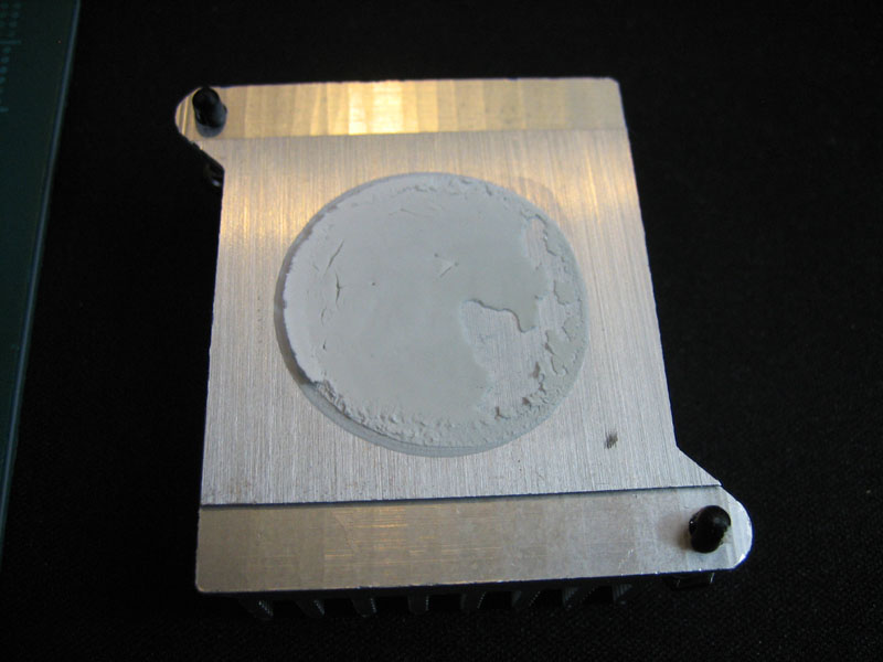 ヒートシンクはシリコングリスでくっついていました。 グリスは固まってしまったのか、触り心地はパンを練ったような硬いさわり心地でした。気になった点といえば、PC用のシリコングリスとは違う変なニオイがした事でしょうか。なんとも言えない気持ち悪くなるニオイがしました。