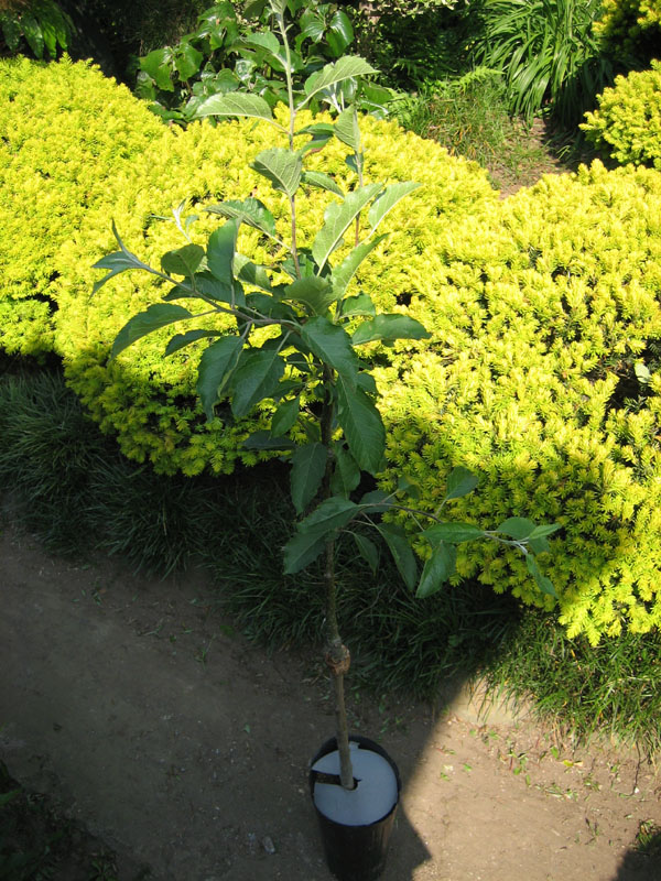 樹高約1mの立派な苗なのですが、接木部分が気になりました。カルスらしき塊がかなり肥大しています。これは、大丈夫なのか?と心配になりましたが、上に接がれたアルプス乙女の部分が異常無く成長しているので、問題ないと判断。庭に植えつけることにしました。