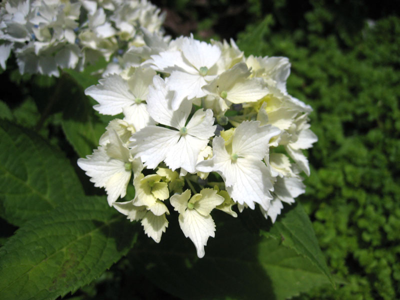 この品種も南向きの日向に植えてありますが、葉っぱに異常が無くとても元気です。もしかすると、地面に広がっている多肉植物のマルチングが何か良い効果を山アジサイに発揮しているのかもしれません。