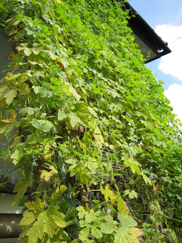 上の写真はゴーヤです。緑のカーテン(グリーンカーテン)の代表ですね。ゴーヤはかなり優秀で虫や病気の心配も少なく、手入れを殆どせずとも全体的に綺麗に広がって安定した成長をしてくれました。隙間の大きさや影の量も調度良いです。