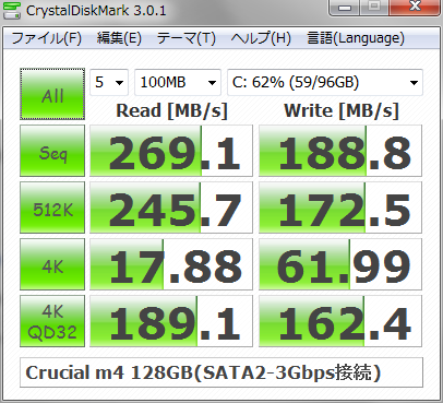 SATA2.0のボトルネックにより、M4の性能は出しきれていません。SATA3.0だと倍近い速度が出るみたいですがSATA2.0接続では仕方がない結果です。(速度情報については以下のconecoの記事などを参照)