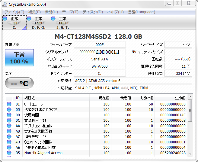 ファームウェアは000Fでした。SATA3.0、6Gbps(600MB/s)対応です。まあ、他に特筆する事は無いですね。