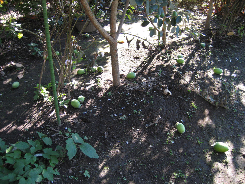 収穫したのは上の写真のように風で落果した実、手で触ると簡単に落果するような実だけを収穫しています。落果しない実はまだ熟していないと思われるので、そのまま木に残しました。残っている実は大体20個程です。