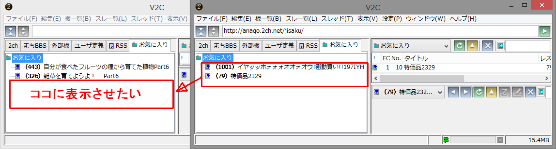 説明の為に、お気に入りを2つだけ登録したV2Cを2つ用意しました。