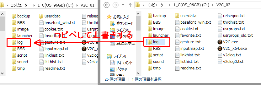 まず、V2C(その2)から、V2C(その1)にdatファイルの入った『log』フォルダをコピー&ペーストして上書きします。