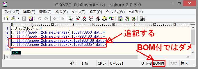 V2C(その1)とV2C(その2)のfavorite.txtファイルをWindowsのメモ帳以外のテキストエディターで開きます。(私はサクラエディタを使いました。)