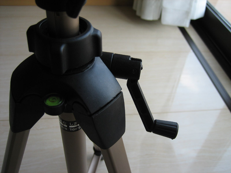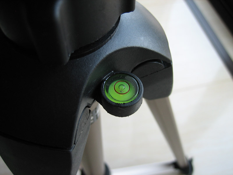 写真右(又は下):三脚足の付け根には水準器がついており、三脚の水平を取る時に便利です。ただし、カメラ等の水平を取るための水準器はありません。