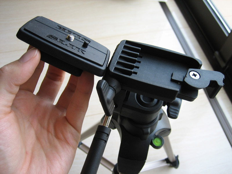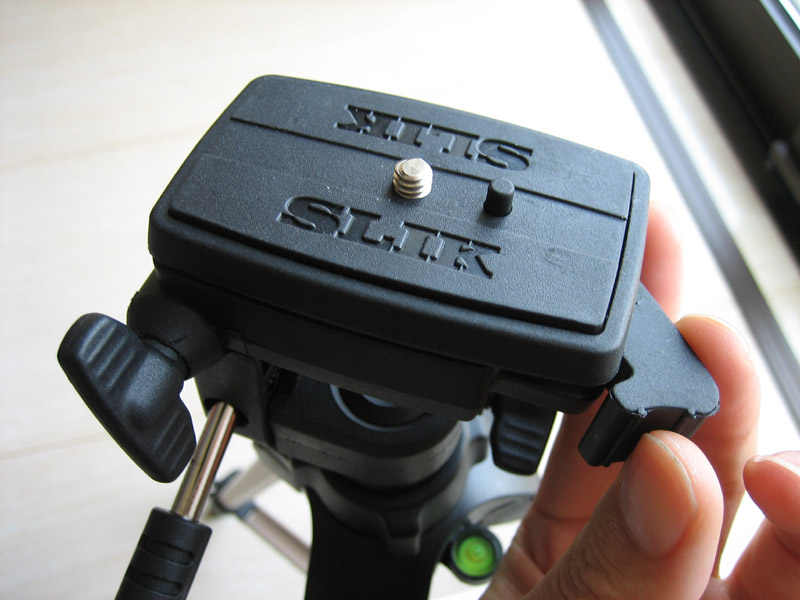 ただ、備え付けのデカいクイックシューにコンデジを取り付けるのは使い勝手が悪いと感じたので、SLIKの小さなクイックシュー、DQ-10N(→ Amazon)を別途購入して使用しています。