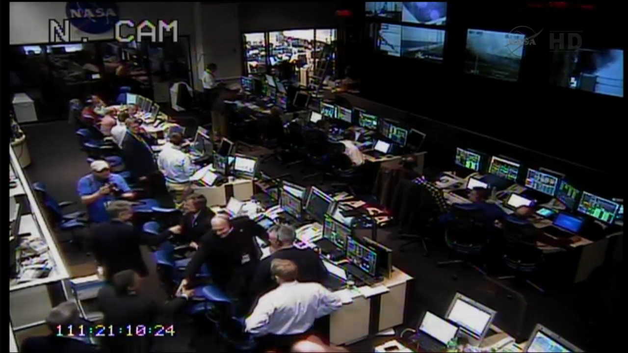 歓喜している管制室の様子です。