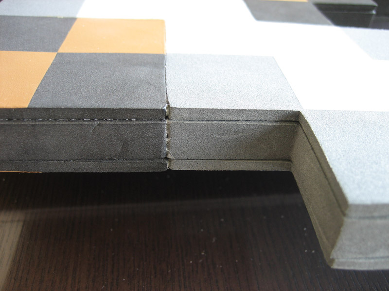 構造は、ドット絵が塗装されたEVAフォームを芯材のEVAフォームに接着した構造となっています。海外商品の玩具なので接着が少々雑なのはご愛嬌です。