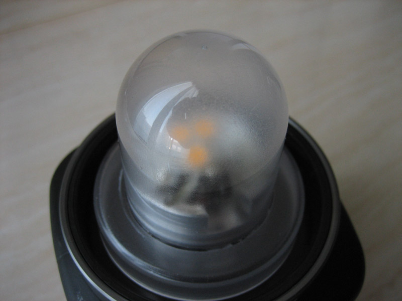 写真右(又は下):下部のLEDを覆うグローブの中に見えるオレンジ色をしたものが、チップ型LED素子です。小型電球25W以上に相当する280ルーメンの光束を発するだけあって、大型のLED素子を3つも搭載しています。