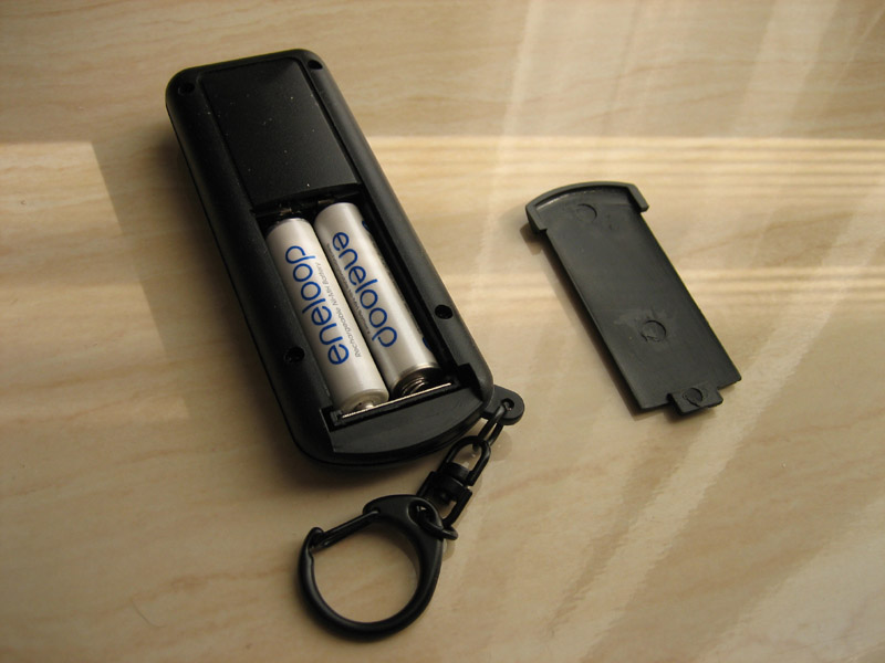 写真左(又は上):リモコンの電池は単四形電池を2個使用します。リモコンもエネループが使えました。