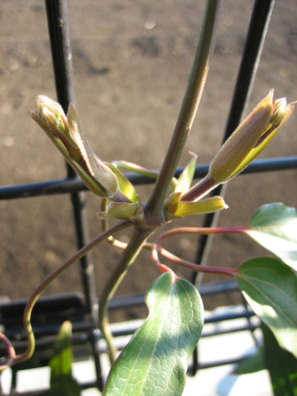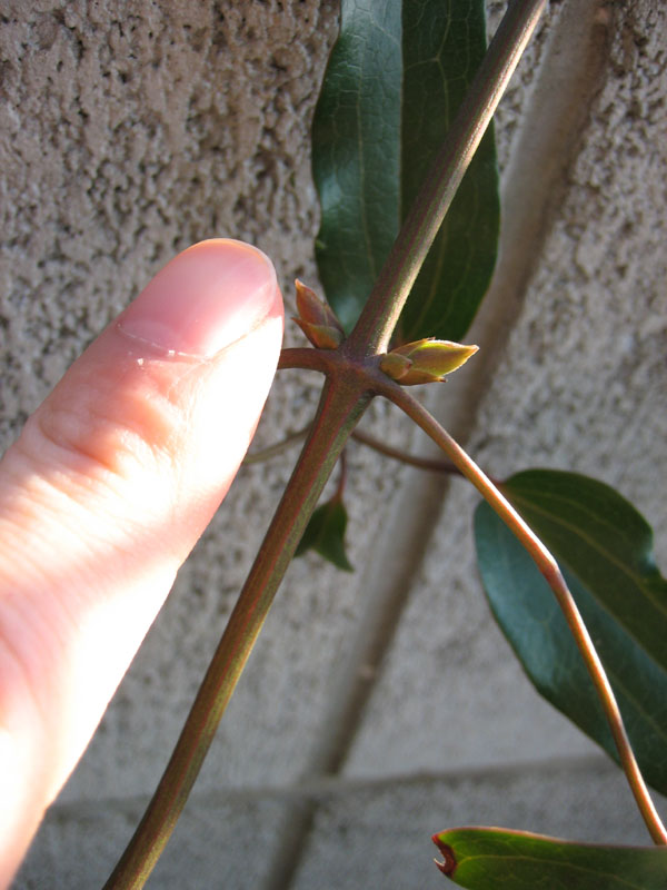 植え付け2年目のアーマンディーです。つるは2倍くらい伸びましたが、日陰になることがあるせいか、もしくは土が良くないからか成長が遅い気がします。今年も花芽はつきませんでした。