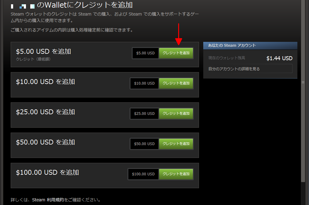 【(自分)のWalletにクレジットを追加】ページが表示されるので、好きな金額の【クレジットを追加】を選択します。