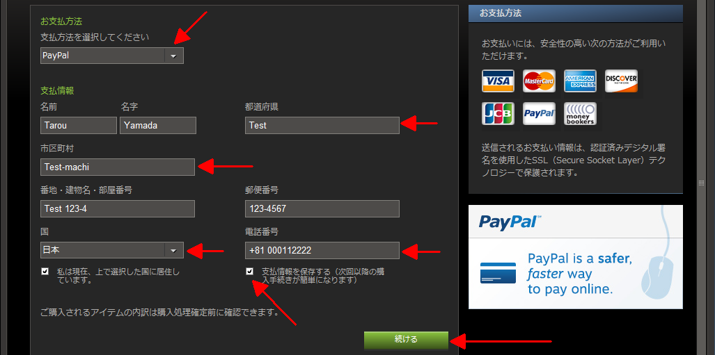 【都道府県】の所ですが、都道府県名の後に都や県(- toや、- ken)は入れても入れなくてもOKです。私自身入れていませんが、問題なく決済出来ています。
