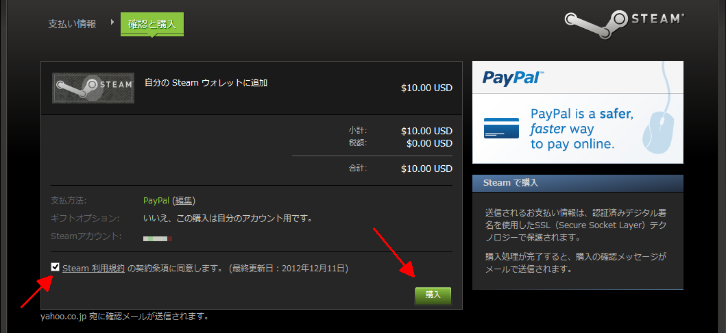 【確認と購入】ページが開くので、【Steam 利用規約の契約条項に同意します。】のチェックボックスにチェックを入れて、【購入】ボタンをクリックすれば購入完了です。