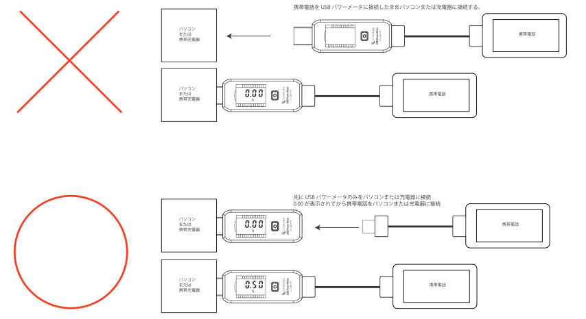 先に計測したいUSB機器を接続してしまうと、正しい電流値を計測出来ません。
