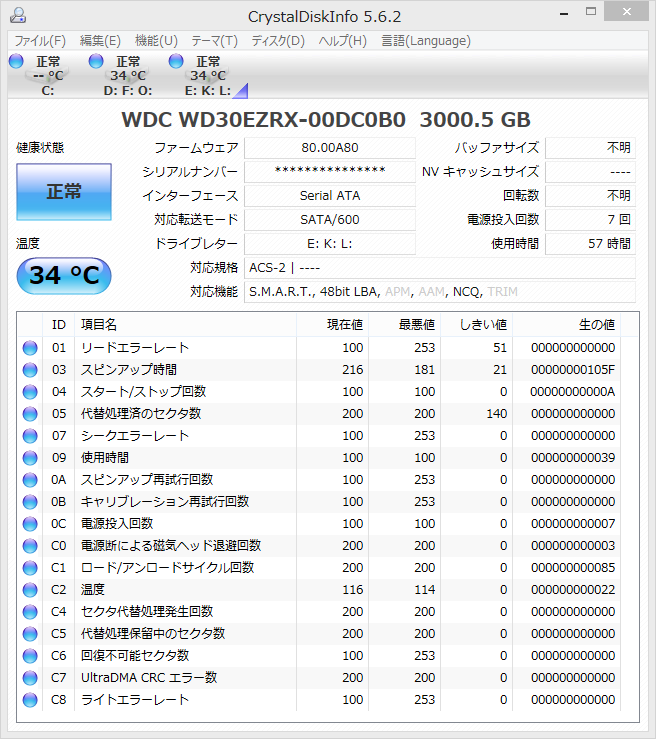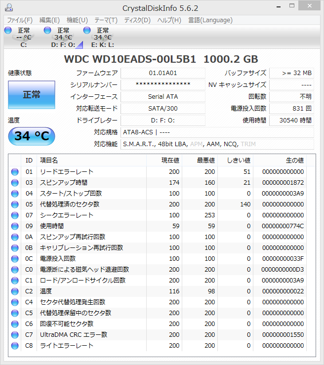 CrystalDiskInfoで、HDD情報とS.M.A.R.T.情報を取得してみました。