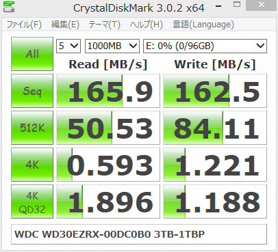 上の画像がベンチマークの結果ですが、WD30EZRXは、Sequential Read/Writeが160MB/sを超える結果となりました。