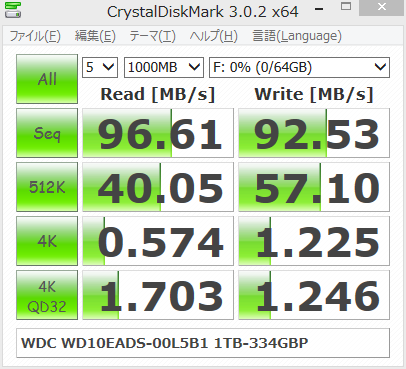 ちなみに、WDや他社の3TBモデルで回転数が7200rpmの物は、Sequential Read/Writeが180~190MB/sになる様ですが、WD GreenシリーズのMAX回転速度は5400rpmと言われているので、7200rpmとの回転速度の差を考えると妥当な速度かなと思います。