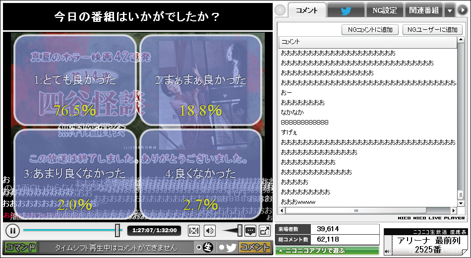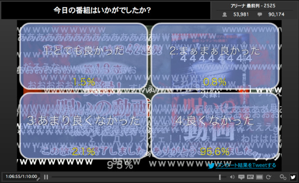 次の画像は、アンケ結果で『4:良くなかった』が95.6%という、ニコ生史上記録的な結果を残した『実録!呪いの動画』の画像です。