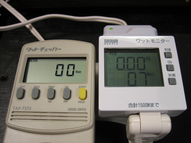 ワットチェッカーは0Wのままですが、ワットモニターには0.7Wと表示され、小数点以下の消費電力を計測出来てる事が分かります。