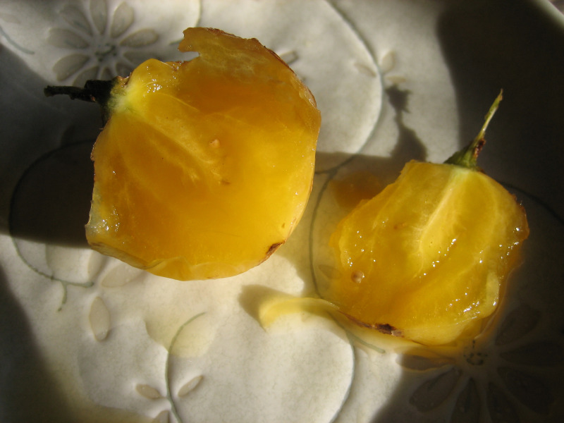 左の少し大きめの実がペピーノ、右の4つの実がイエローストロベリーグアバの実です。