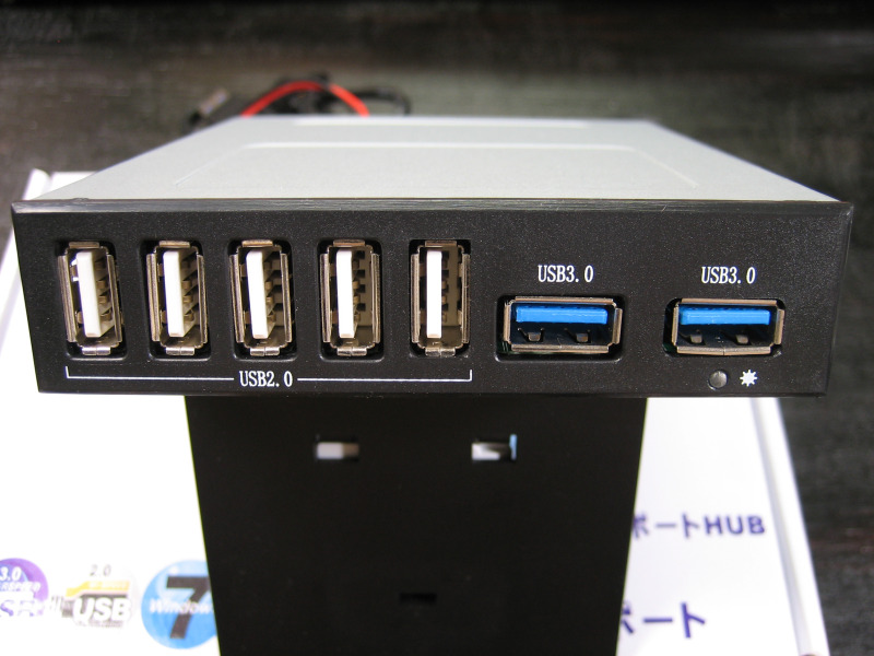 左の5ポートがUSB2.0ハブ、右の2ポートがUSB3.0(又はUSB2.0)で、ベゼルは黒いつや消しプラスチック製、右下に青色LEDのアクセスランプがあります。