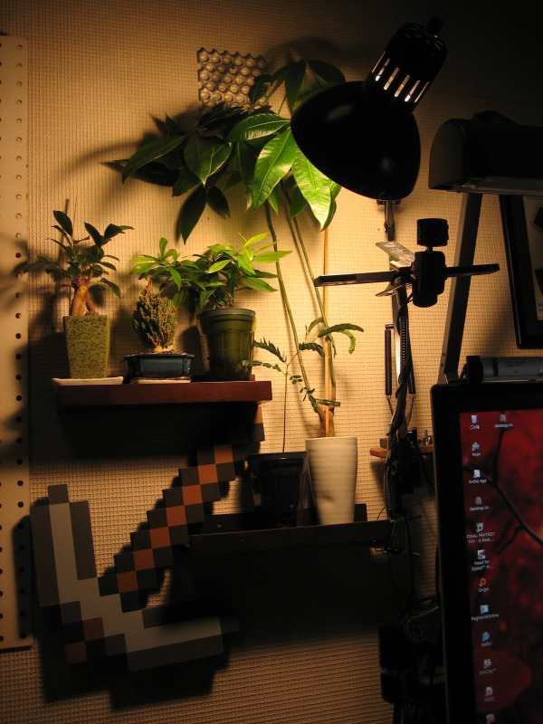(夜の)PCモニタ裏の棚を見せたいと思います。というか、室内で照明を当てて育てている植物の紹介です。