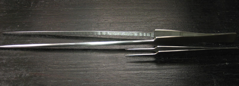 個人的にはこちらの細身で真っ直ぐなピンセットの方が、狭い場所に突っ込んで目視しながら作業するのに使いやすいので好きです。