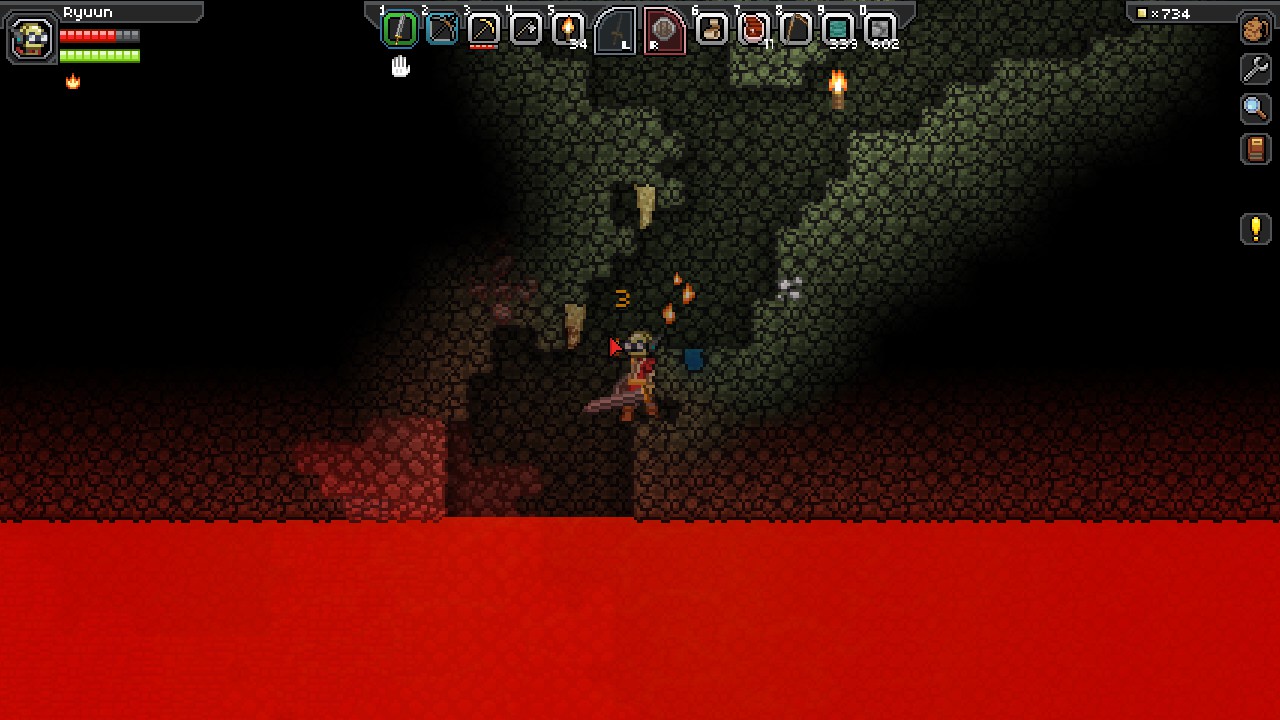 マグマダイブすると体が燃えますが、簡単に抜け出る事が出来て、アイテム消失も無いので、マイクラやテラリアよりは脅威では無さそうです。