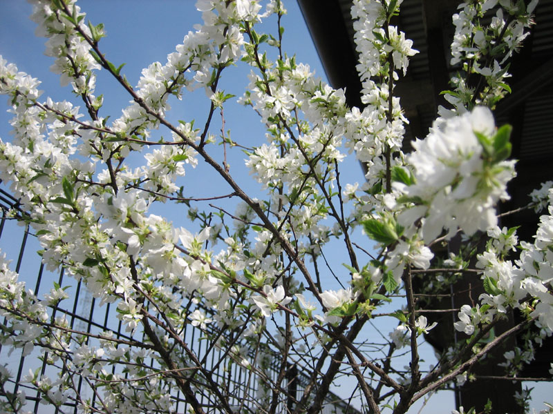 白実ユスラウメも満開です。まあ、若干満開を通り越して花が散ってきていますが・・・。