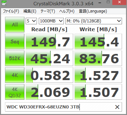 WD30EFRXは、Sequential Readが149.7MB/sで、WD30EZRXよりも速度が遅くなりました。