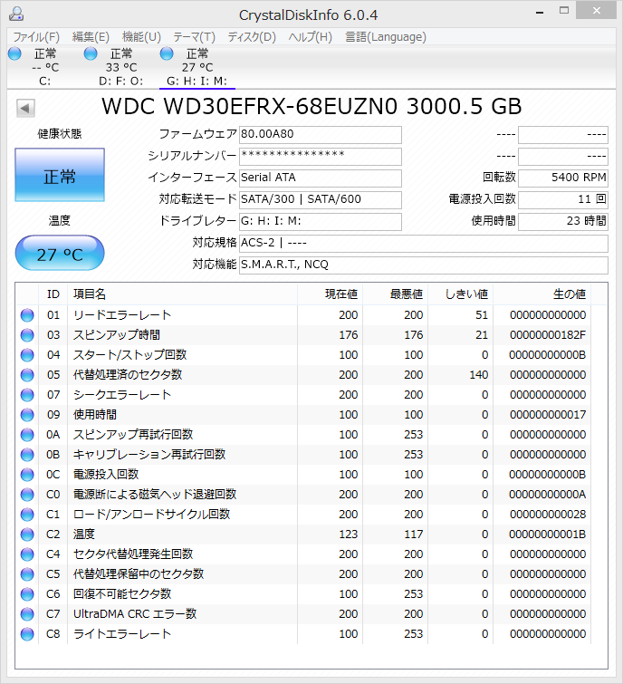 CrystalDiskInfoで調べたS.M.A.R.T.値に問題は無し。